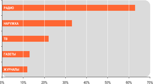 Исследования, проводимые западными рекламистами, свидетельствуют о том, что целесообразность применения теории "recency" неодинакова для различных СМИ. На диаграмме 1 показан процент охваченных рекламным сообщением менее чем за час до совершения покупки. Радио прекрасно подходит для планирования по теории "recency", наружная реклама и телевидение - несколько хуже, а газеты и журналы для этого малопригодны.