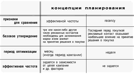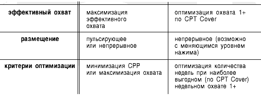 На первый взгляд концепция "recency" может показаться частным случаем концепции "эффективной частоты" для случая поддерживающей рекламной кампании "раскрученного" бренда. Однако это не так. В таблице 1 приводятся сравнительные характеристики двух концепций медиапланирования. Из таблицы видно, что оптимизация в рамках каждой концепции производится по разным критериям. В реальной ситуации получается, что концепция "эффективной частоты" предлагает более высокий уровень охвата, соответственно, бюджет расходуется несколько быстрее, чем в теории "recency". Это вынуждает нас использовать не непрерывное, а пульсирующее размещение, либо сокращать период рекламной кампании. Таким образом, в случае поддерживающей рекламной кампании "раскрученного" товара (при соблюдении вышеописанных характеристик товара) предпочтительнее придерживаться теории "recency".