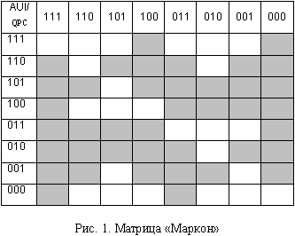 Различным параметрам (Q, Р, С, MСА, MCU, MCI) каждого изделия присваиваются двоичные коды (0 или 1) в зависимости от того, "выгоду" или "проигрыш" относительно среднего взвешенного значения ассортимента дает изделие (по данному конкретному параметру). Каждый изделие товарного ассортимента определяется двумя сериями двоичных кодов 0 или 1. Первая относится к "решающим" параметрам: Q, Р, С, вторая - к "контрольным": MСА, MCU, MCI. Каждые изделие характеризуется последовательностью из шести цифр 0 и/или 1 в разных сочетаниях. Изделия, которые характеризуются одной и той же серией 0 и 1, имеют одинаковое положение на рынке. Так определяются однородные маркетинговые группы товарного ассортимента. Для одновременного анализа всех изделий необходимо построить таблицу двойного ввода, в вертикальных колонках которой указываются тройки кодов Q, Р, С, а в горизонтальных - тройки кодов МСА, MCU, MCI. Итак, получается матрица, состоящая из 64 ячеек (рис. 1)