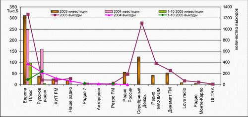 РАДИО. Объем рекламных инвестиций на радио с каждым годом постепенно сокращается, например, в 2004 году по сравнению с 2003 рекламные инвестиции сократились на 35%, а в 2005 году – сократились на 53% по сравнению с аналогичным периодом 2004 года.