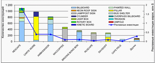 НАРУЖНАЯ РЕКЛАМА. Наружная реклама использовалась на протяжении всего исследуемого периода. В 2004 году, по сравнению с 2003, рекламные инвестиции категории "Растворимый кофе" сократились на 25%, а за десять месяцев 2005, по сравнению с аналогичным периодом 2004 года, инвестиции увеличились на 55%. Сезонность в наружной рекламе выражена слабо. Чаще всего в категории "Растворимый кофе" в течение периода январь 2003 – октября 2005 гг. использовались биллборды (щит 3х6 м) – в 32% случаев и брандмауэры (Painted Wall) – 31%. На крышные установки с использованием неона и внутренней подсветки (NEON ROOF SIGN) приходится 11%. Самые активные марки в наружной рекламе за исследуемый период: Nescafe, Carte Noire, Ambassador, Kaffa, Brooke Bond Bon, Maccoffee, Davidoff.