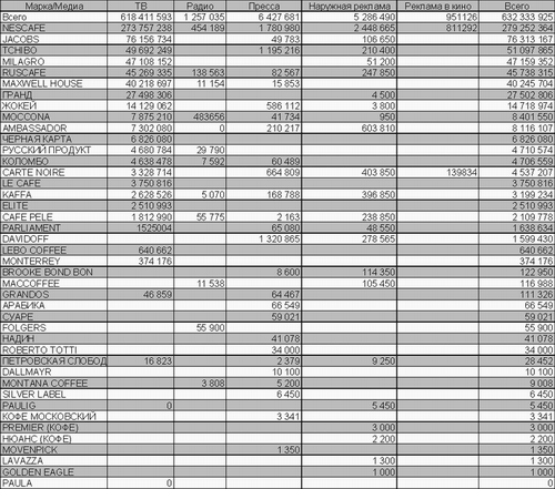 Реклама категории "Растворимый кофе" носит сезонный продуктовый характер. Те марки, рекламный бюджет которых это позволяет, рекламируются на наиболее массовом носителе – телевидении, это примерно 60% всех рекламирующихся марок растворимого кофе, а их всего 42. Также рекламодатели используют прессу (различные издания) и наружную рекламу, которые, как и ТВ, могут нести визуальный ряд, что позволяет достичь определенного уровня запоминания марки кофе (логотипа). Радио как рекламоноситель является тем носителем, который, будучи дополненным ТВ, дает хорошие результаты по поддержанию показателя знания и запоминания. Радио лучше работает тогда, когда в умах потребителей уже запечатлен имиджевый образ марки, и ему остается только пробудить воображение, напомнить и вызвать этот образ из памяти потребителя.