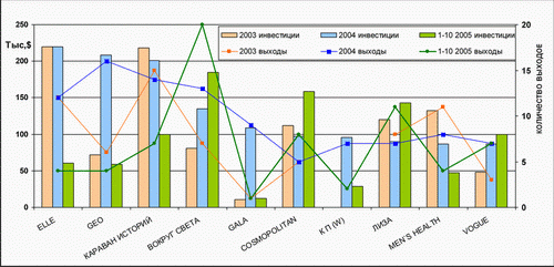 Рисунок 5. Распределение рекламных инвестиций (левая ось) и количества выходов (правая ось) рекламы между изданиями (топ - 10) за весь исследуемый период (поранжировано по инвестициям за 2004 год)