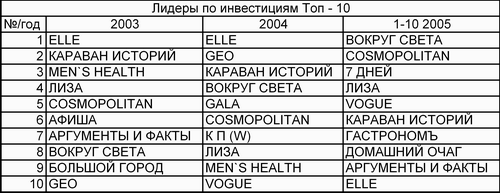 В 2004 году и за 10 месяцев 2005 г. более активно стала размещаться "кофейная" реклама в журнале "Вокруг света". Это издание стало лидером по рекламным поступлениям в 2005 году, на втором месте – "Cosmopolitan", далее "7 Дней", "Лиза", "VOGUE". Журнал "Вокруг света" также лидирует и по количеству выходов рекламных сообщений за 2005 год. Изменения позиций лидеров по годам можно проследить в таблице 2.