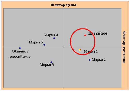 - Размещение в построенном семантическом пространстве оцениваемых объектов, анализ получившегося распределения. Оценка расстояния между тестируемыми объектами и идеальным объектом (например, идеальный йогурт, автомобиль, "я сам" и т.п.), для определения "положительных" полюсов факторов. Например, если мы получили фактор "модность, стильность, яркость" автомобиля, то важно понять являются ли высокие оценки нашей марки по этому фактору позитивом для целевой аудитории или нет. Быть может для них идеальный автомобиль – это надежный, консервативный "железный конь", экономичный по расходу топлива и без особых причуд в дизайне.