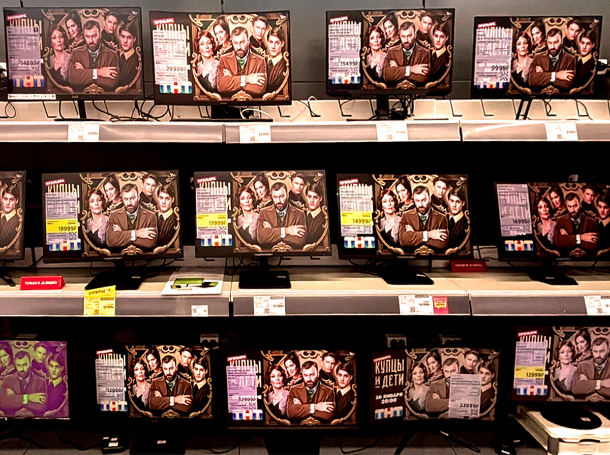 В М.Видео-Эльдорадо протестировали два формата размещения. Первый — экраны внутри торгового зала, второй — каскадное размещение ролика на всех видеоносителях в локации: телевизорах, мониторах, ноутбуках, планшетах, смартфонах, которые объединены в единую медиасеть, что позволило получить более 200 единиц рекламного инвентаря внутри торговой точки, работающего одновременно. Во всех возрастных группах более 90% опрошенных обратили внимание на рекламу сериала. Это подтвердило релевантность и эффективность данного канала. Дополнительный эффект оказала актуальность транслируемого контента — полное попадание в ядро аудитории. Примечательно, что разные возрастные и соцдем-группы реагировали на различные носители. Представители молодежи отмечали, что сначала обратили внимание на рекламный ролик на планшетах и смартфонах, потом увидели остальные носители. Мужчины среднего возраста в большей степени реагировали на мониторы и ноутбуки. Женщины среднего возраста и представители групп 45-55 и 55+ обращали внимание сначала на ТВ, после — на все остальные носители.