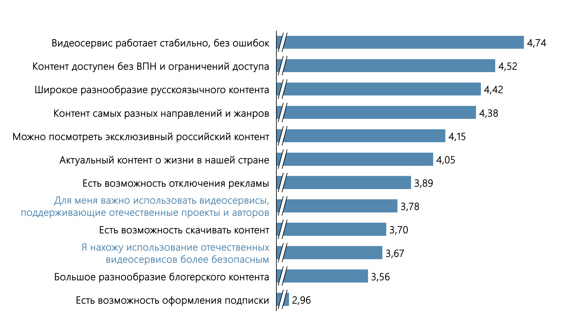 Вот наиболее значимые пять: стабильная работа сервиса (отсутствие ошибок) — 4,7 балла, доступность без VPN — 4,5 балла, разнообразие русскоязычного контента — 4,4 балла, разнообразие контента (направление и жанры) — 4,4 балла, наличие эксклюзивного российского контента — 4,3 балла.