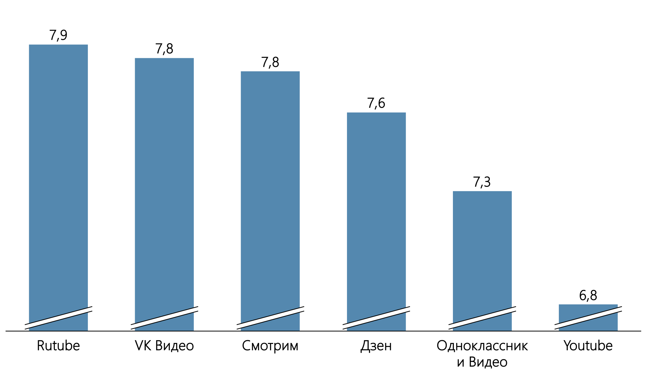 По доступность сервиса лидируют Rutube, «VK Видео», «Дзен» — 8,6 балла. У «Одноклассники Видео» 8,5 балла, у «Смотрим» — 7,9, у YouTube — 6,5.