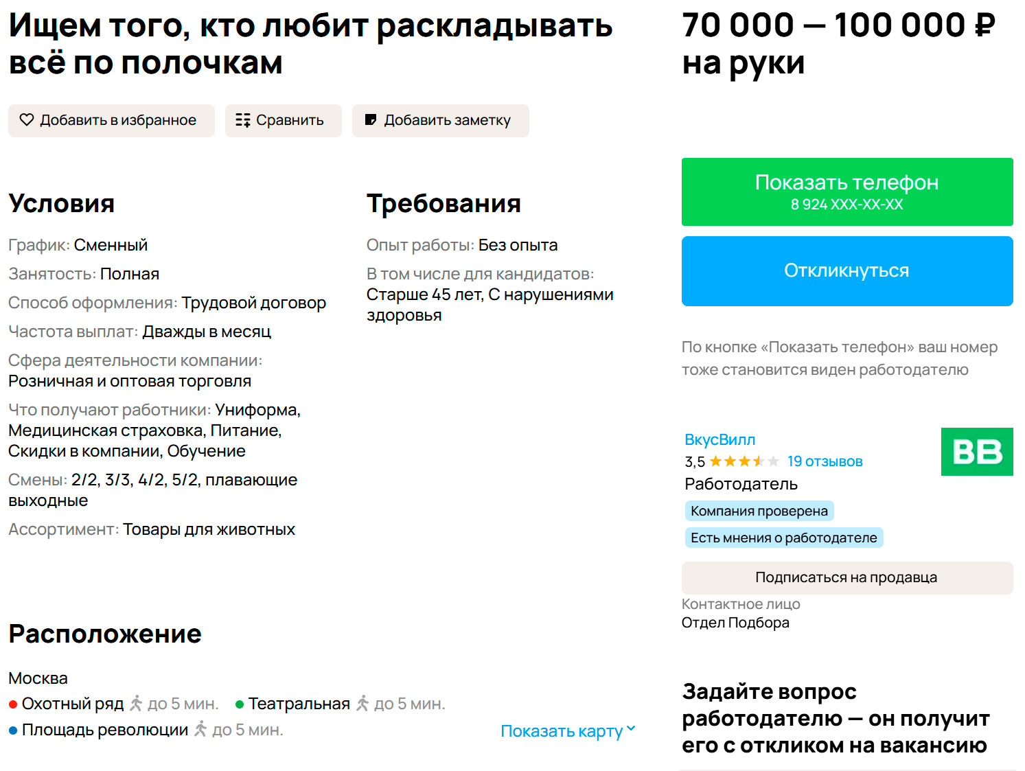 Он создаёт уют в магазине, замечает, когда кому-то нужна помощь, и находит общий язык даже с собаками посетителей. Условия — до 87 000 рублей в месяц, забота о здоровье и питании, бонусы и, конечно, никаких штрафов.