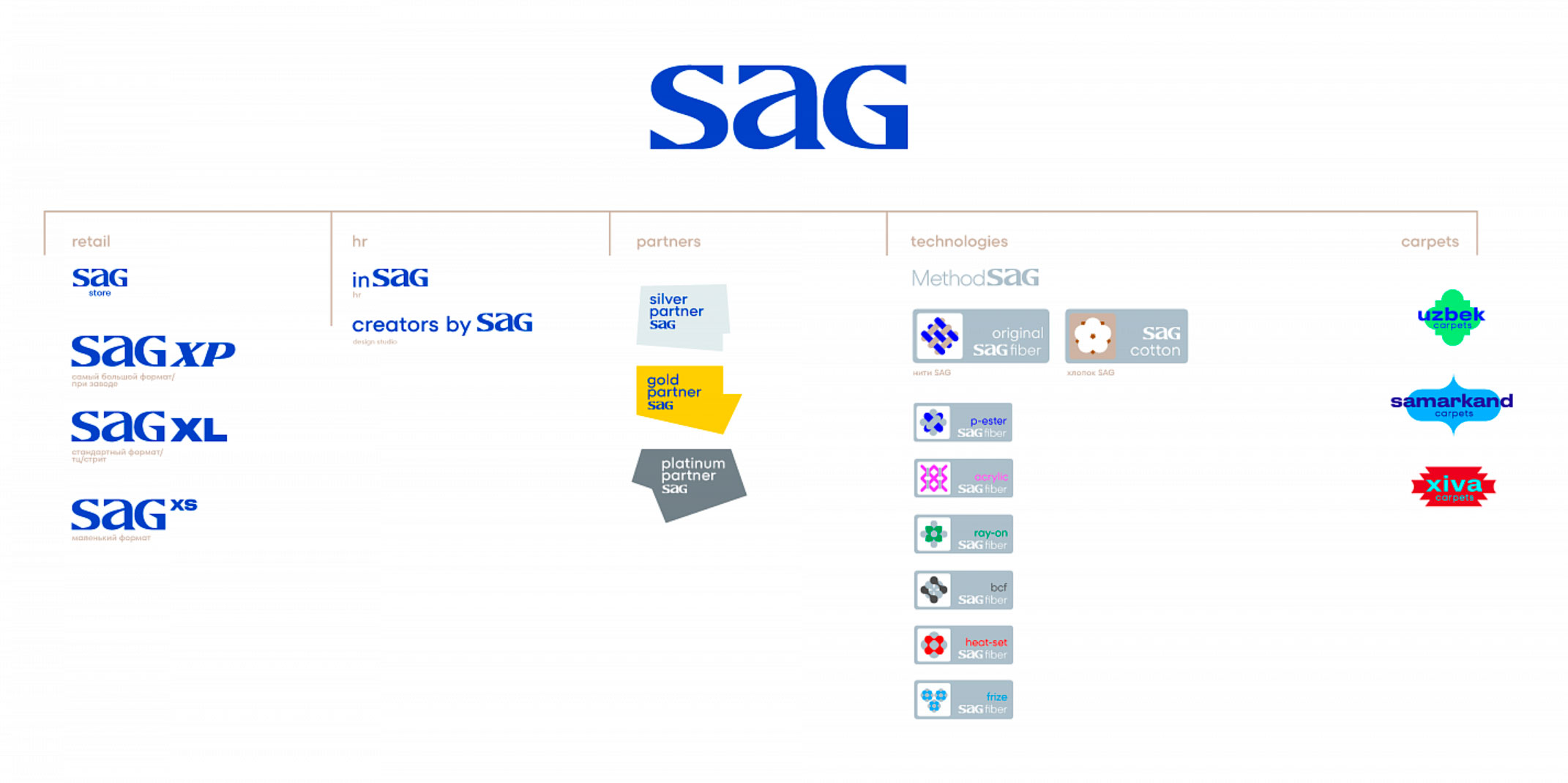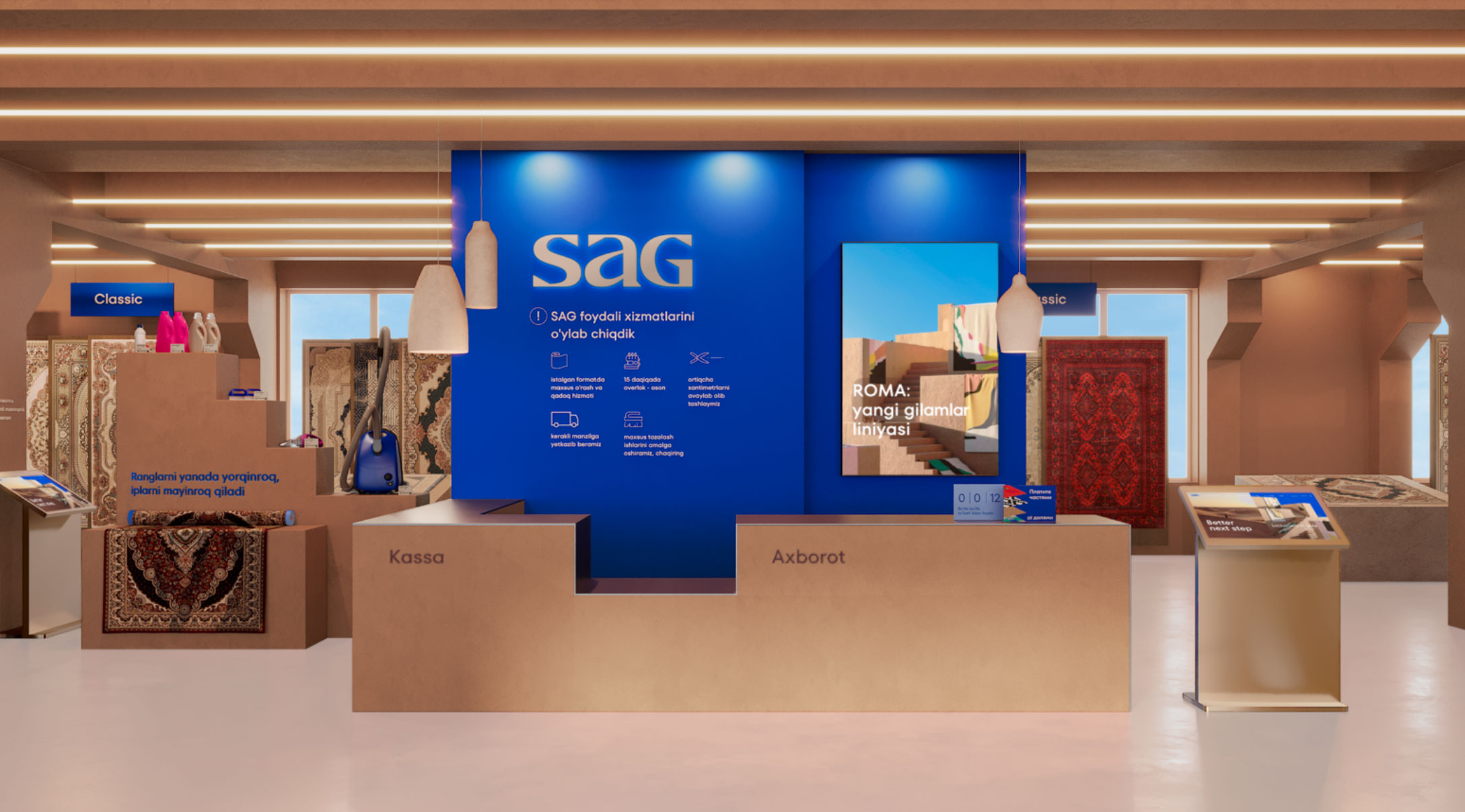 SAG — крупный производитель и ритейлер ковров из Узбекистана, входит в топ-3 в мире. Компания меняет представление о том, каким может быть бренд в традиционной товарной категории продажи ковров. В рамках масштабного ребрендинга SAG команда Depot провела большую работу над оформлением ритейл-пространства. Новое позиционирование «уровень SAG» транслирует уверенность и лидерство производителя. Следующим логичным шагом стало развитие ритейл-направления.