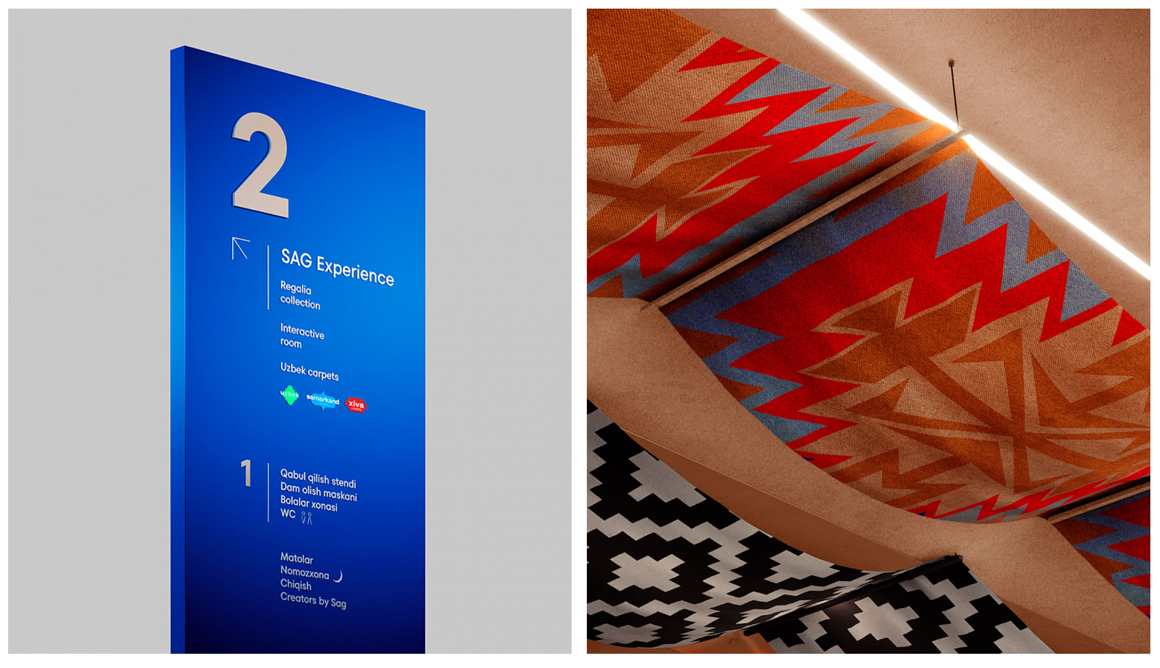 В пространстве также используются паттерны из айдентики SAG — они помогают выделить ключевые зоны и работают как визуальные акценты, поддерживая общий характер среды и усиливая узнаваемость бренда.