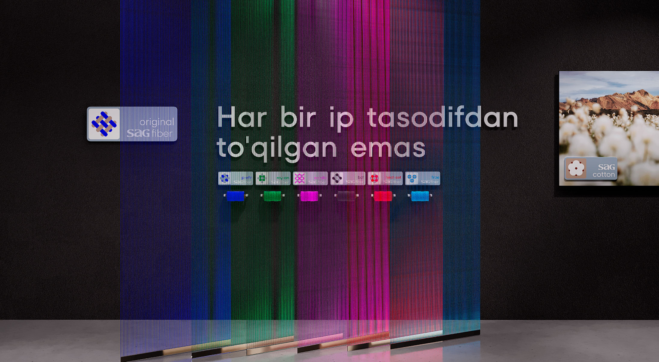 Центральное место занимает интерактивная зона, посвящённая нитям и хлопку собственного производства SAG, выпускаемому под суббрендом Method SAG. Наглядная экспозиция включает шесть типов нитей, включая экземпляры, сделанные из переработанных материалов. Все образцы можно потрогать и изучить — это помогает лучше понять свойства волокон и принципы производства.