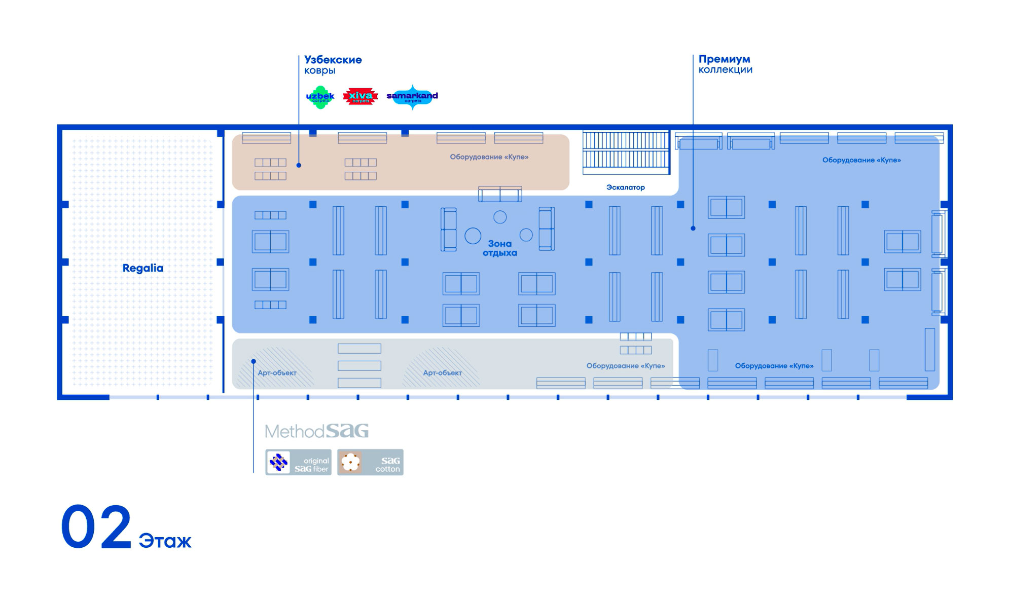Второй этаж оформлен как информационно-выставочное пространство с акцентом на материалы, культуру и состав. Здесь представлены премиальные и этнографические коллекции: ковры серии Regalia, а также узбекские, самаркандские и хивинские изделия, различающиеся исторически устоявшимися цветами и типом плетения.