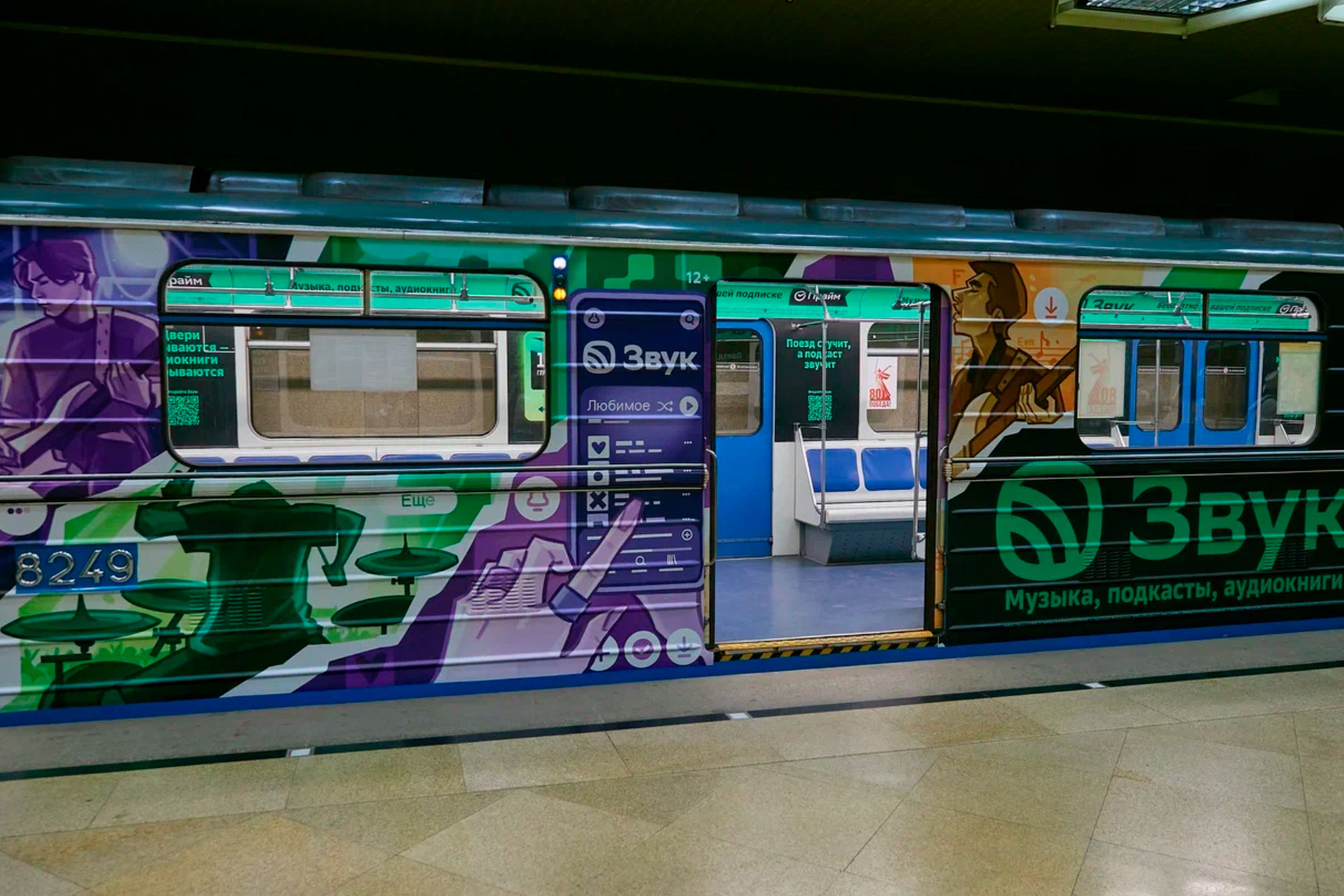 Особая «изюминка» проекта – интеграция цифрового и офлайн-контента: прямо в вагоне размещены QR-коды, ведущие к эксклюзивной подборке музыки, подкастов и аудиокниг «По пути со Звуком» в приложении Звук. Музыкальный сервис привлекает внимание пассажиров к контенту сообщениями: «Слушайте музыку без остановок», «Двери закрываются – аудиокниги открываются» и «Поезд стучит, а подкаст звучит». Так бренд связывает городской ритм с личными аудио открытиями людей, делая поездку в метро не просто дорогой, а настоящим музыкальным путешествием.