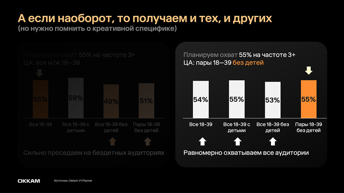 По оценке Okkam, парные домохозяйства без детей в России насчитывают 7,1 млн человек. Если объединить эту категорию с одиночными домохозяйствами, образуется сегмент объемом 14,5 млн человек с повышенными доходом и медиапотреблением. Эта аудитория в среднем имеет доход на человека на 19% выше по сравнению с семьями, где есть дети до 18 лет, и в среднем по всем каналам потребляет контент на 51 минуту в день дольше.