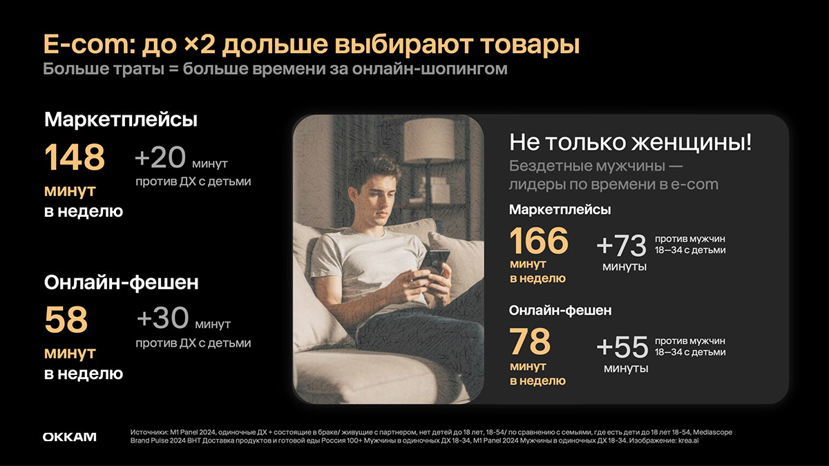 Парные домохозяйства без детей тратят на онлайн-шопинг на 30–80% больше времени, чем семьи с детьми, демонстрируя склонность к долгому выбору и исследованию товаров. При этом, как отметила Дарья Куркина, мужчины-одиночки — неожиданные лидеры. Их вовлеченность в онлайн-покупку одежды (+55 минут) опровергает стереотипы. Это перспективная аудитория для многих брендов.