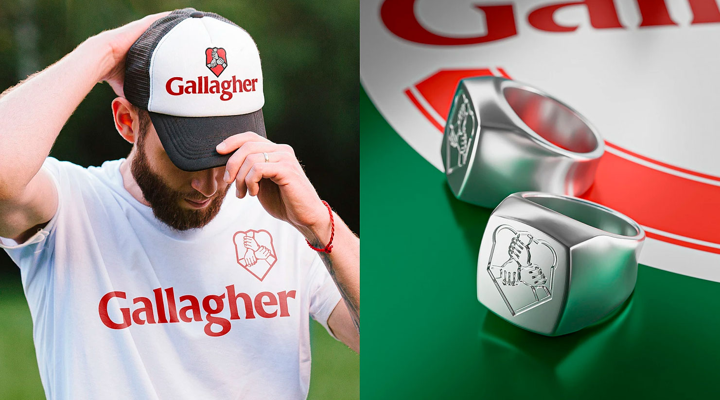 В айдентике центральным элементом стал знак с тремя руками — символ доверия и разделённых секретов — закрытый клуб. Стрелки вокруг логотипа отсылают к объединению и направлению, задающему общий вектор бренда. Визуальное решение основано на традиционных для категории кодах, но с акцентом на свежесть и открытость. Это делает Gallagher заметным на полке и релевантным для выбранной аудитории.