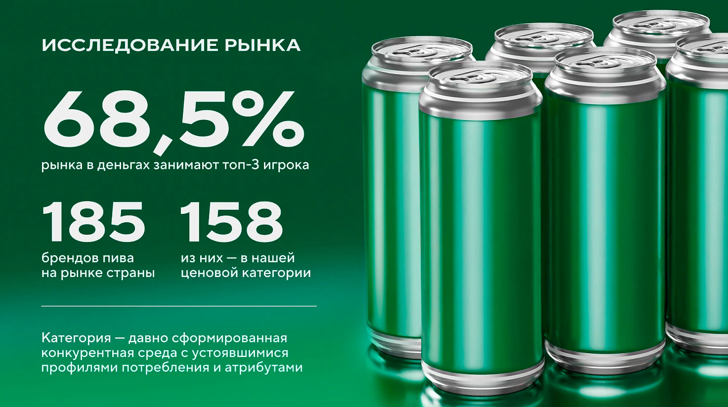 Задача: Перед нами стояла комплексная задача: создать федеральный бренд пива с нуля. Разработка с нуля подразумевает масштабную стратегическую работу, создание позиционирования, нейминг, айдентику и, в этом случае, ещё и форму бутылки.