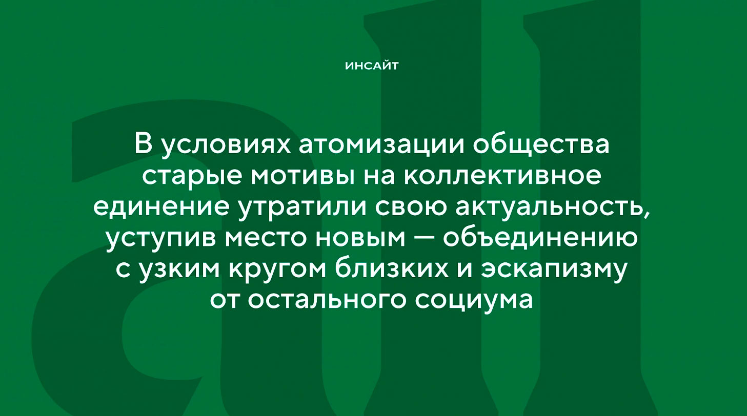 Исследования показали: старый пивной мотив «единение большой компании» больше не работает. В условиях атомизации общества люди ищут не массового объединения, а общения в ближнем круге, микро-коммьюнити, где можно быть собой и делиться личным. Это компании друзей, трайбы поздних миллениалов, для которых важно доверие, а не масштаб.