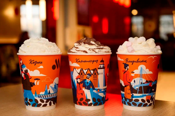 В ресторанах «Вкусно — и точка» горячие напитки начали разливать в стаканчики с изображением зданий, которые ассоциируются с современной Москвой. В стилизованную композицию вошли башни Москва-Сити и «золотая арка» жилого комплекса «ЗИЛАрт», расположенного на набережной Марка Шагала.