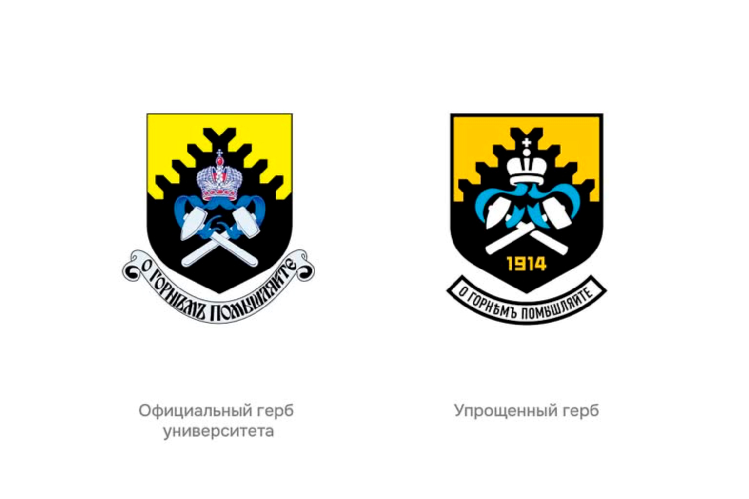 Работая над визуальной айдентикой, дизайнеры агентства сохранили преемственность с гербом, созданным более 20 лет назад. Например, в основу фирменного стиля легли взятые из геральдического описания цвета — черный и золотой. Для digital-среды Восход предусмотрел более лаконичный вариант герба, а для неформальных носителей (мерча, раздаточных материалов и т.д.) — создали первый в истории университета логотип. Центром его композиции также стали кирка и молот, традиционно символизирующие горную отрасль.