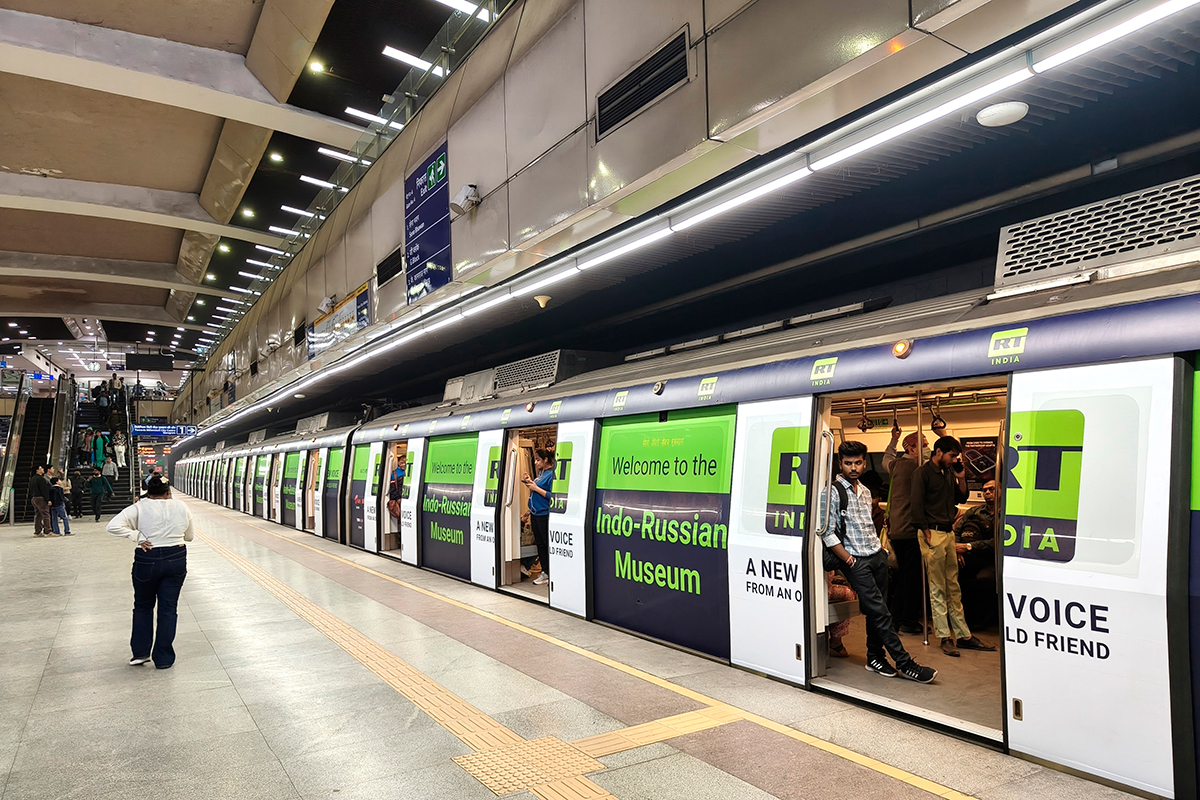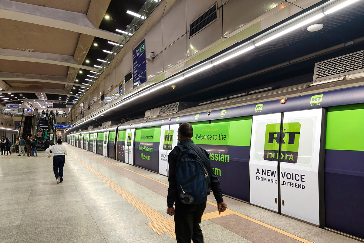 Кроме того, RT запустил уникальную акцию в метро индийской столицы — поезд «Музей России и Индии». Восемь вагонов были брендированы, чтобы представить миллионам пассажиров истории о российско-индийской дружбе (от космического и военного сотрудничества до культуры и спорта). Поезд курсирует по жёлтой линии метро, проезжая 37 станций и почти 50 км маршрута.