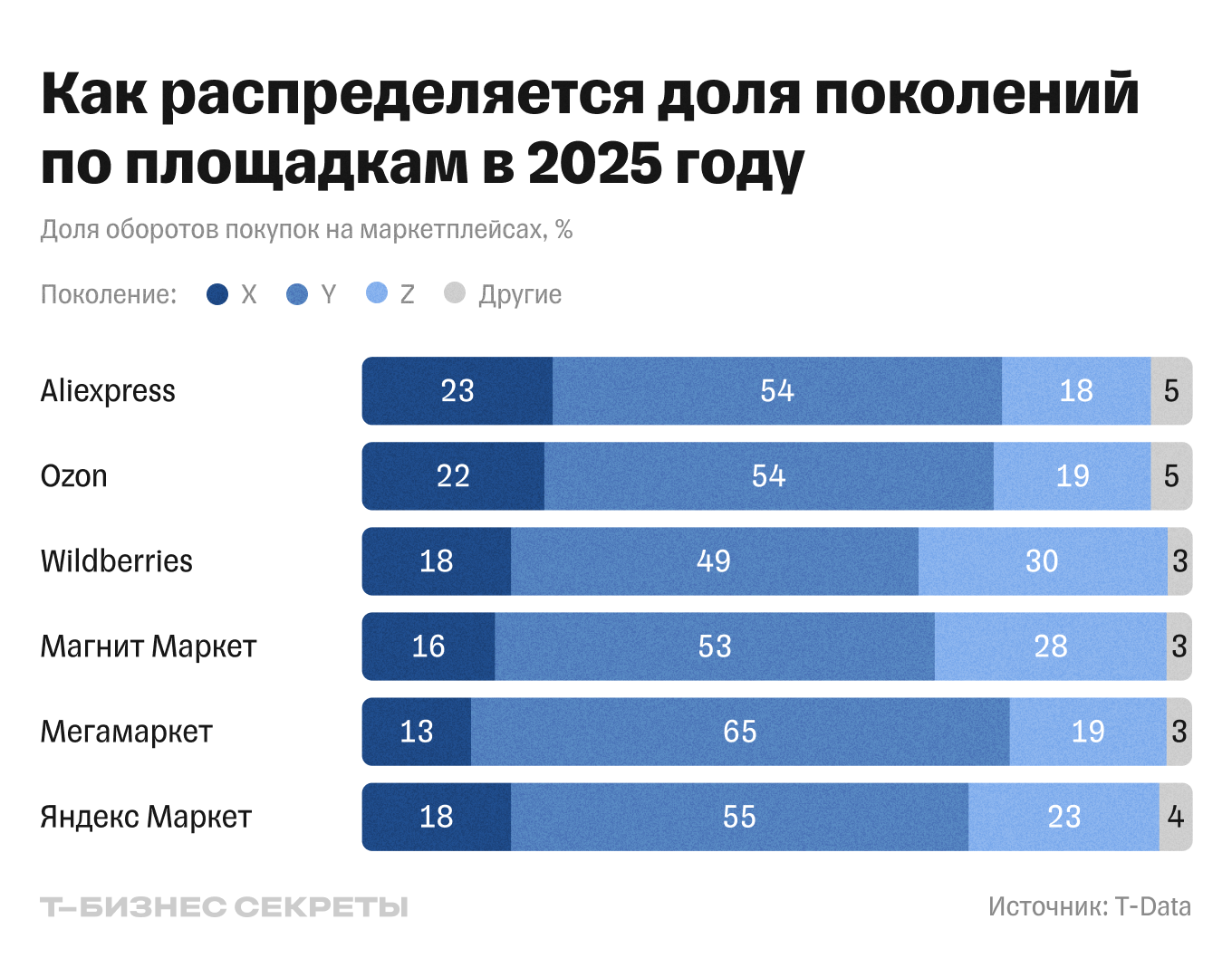 - поколение X: Ozon — 22% (+1 п. п. к 2024), Wildberries — 18% (−1 п. п.), AliExpress Россия — 23% (−1 п. п.);