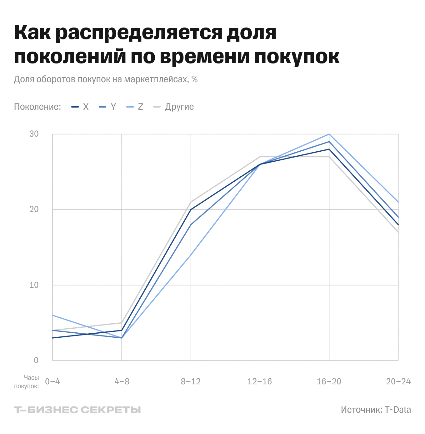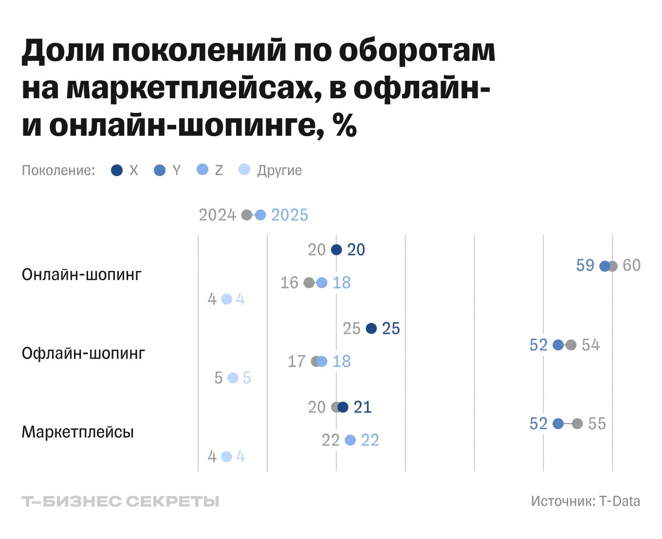 По данным T-Data, в 2025 году основная нагрузка на онлайн-торговлю по-прежнему приходится на миллениалов — их доля составляет 59% оборота онлайн-шопинга, 52% — офлайн и столько же, 52%, — на маркетплейсах. Поколение X обеспечивает 20% онлайн-продаж, 21% оборота маркетплейсов и 25% офлайн-шопинга. Зумеры занимают 18% в онлайн- и офлайн-покупках и 22% на маркетплейсах.