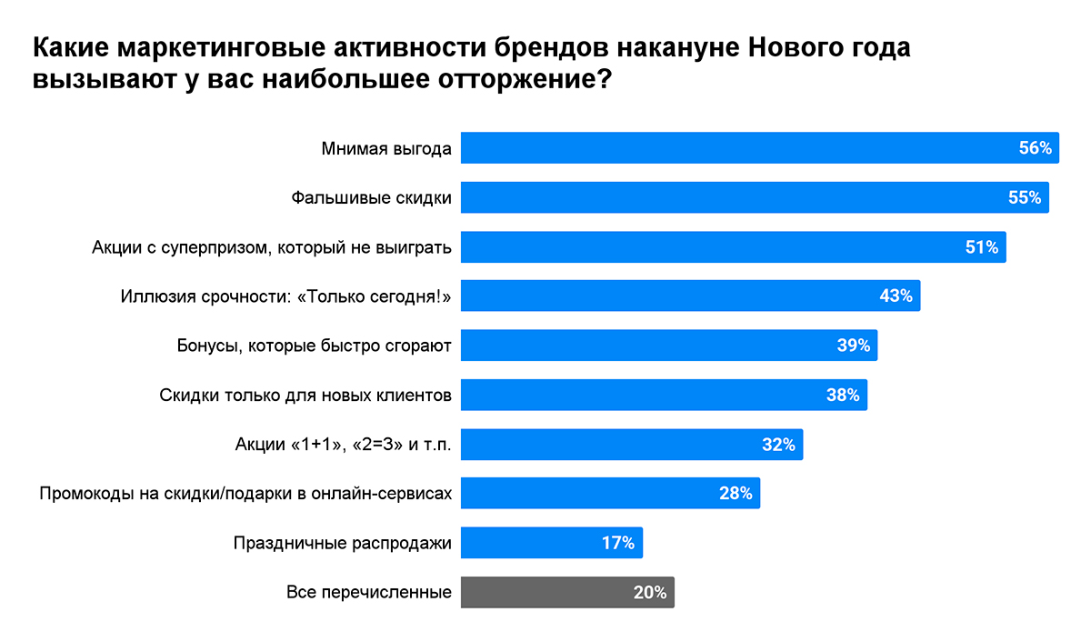 Промоакции призваны побуждать интерес к бренду, но порой выходит ровно наоборот. Эксперты коммуникационного агентства FAVES Communications провели опрос[1] среди интернет-пользователей и выяснили, что накануне Нового года каждого второго особенно сильно раздражают мнимая выгода от брендов, фальшивые скидки и акции с дорогими призами, которые невозможно выиграть. Реже всего отторжение вызывают праздничные распродажи.