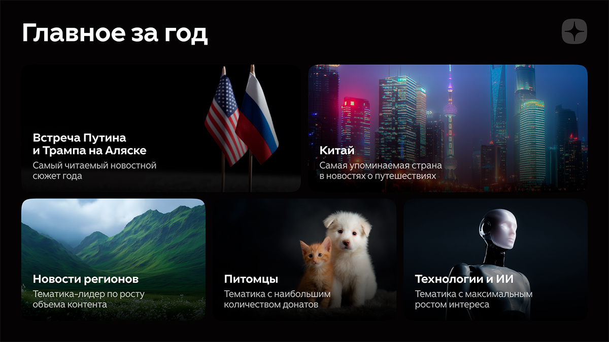 Самым читаемым новостным сюжетом 2025 года стала встреча Владимира Путина и Дональда Трампа на Аляске. В новостях о путешествиях чаще всего упоминался Китай, а одним из самых быстрорастущих направлений контента стали материалы про искусственный интеллект и технологии.