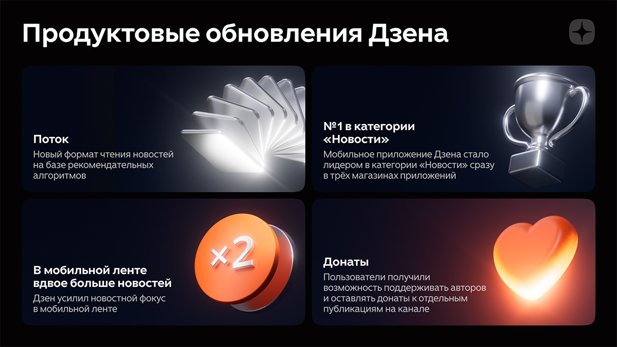 Среди ключевых продуктовых обновлений платформы — новый формат чтения новостей «Поток» на базе рекомендательных алгоритмов, расширение новостного контента в мобильной ленте, где стало вдвое больше новостей, а также первое место в категории «Новости» сразу в трёх магазинах приложений. Для более комфортного потребления контента в Дзене появились тёмная тема и раздел «Интересное», объединяющий самые обсуждаемые новости и блогерские материалы. Кроме того, платформа запустила донаты для поддержки авторов и представила новый рекламный инструмент «Промо видео».
