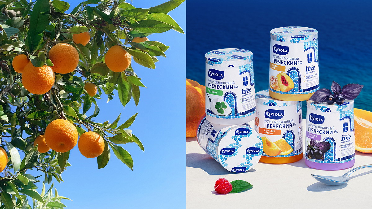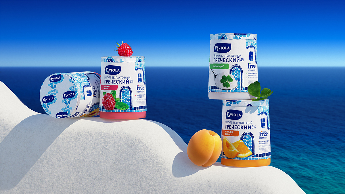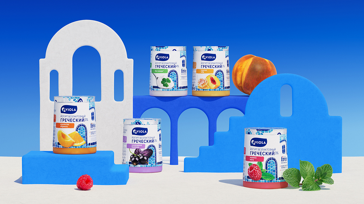 Мы разработали концепт «греческий город» в котором рождается целая история: где-то рядом море, улочки, лазурные ставни и двери, сине-голубая мозаика… Атмосфера греческого города, наполненного ароматами чистого воздуха и свежих цитрусов, отразилась в новых вкусах йогурта Viola.
