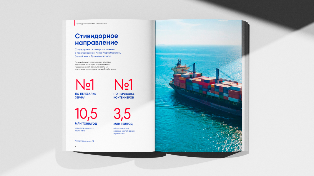 Цветовая система включает три ключевых оттенка: «глубокий морской синий» является основным и символизирует надёжность и масштаб. Его дополняют два нейтральных оттенка – «парусный белый» и «металлический серый», которые обеспечивают баланс и универсальность применения. Акцентный красный выполняет функцию выделения небольших текстов или графики на макетах.