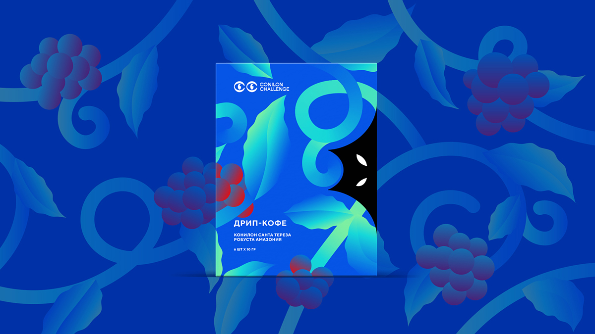 Упаковка содержала много важной информации, нужно было рассказать и о самом чемпионате, и о разнице вкусов, вошедших в новый сет дрипов, сортов, их происхождении, но сделать это компактно и оригинально. Решение было найдено — визуально упаковка превратилась в некий «трактат». На обложке поместили маскота Котилона в переплетающихся ветвях кофейного дерева в стилистике дизайна года Амазонии. На развороте расположили общую информация о Conilon Challenge и победителе этого года. Внутри, с двух сторон, разместили подробное описание каждого лота. Синяя часть упаковки с конвертом для робусты из штата Родония была вдохновлена глубиной и изгибами реки Амазонки. Черная часть, посвященная конилону из Эспириту Санту, сохранила связь с прошлогодним дизайном и Котилоном. На обратной стороне разместился рецепт от победителя по завариванию с видеоинструкцией.