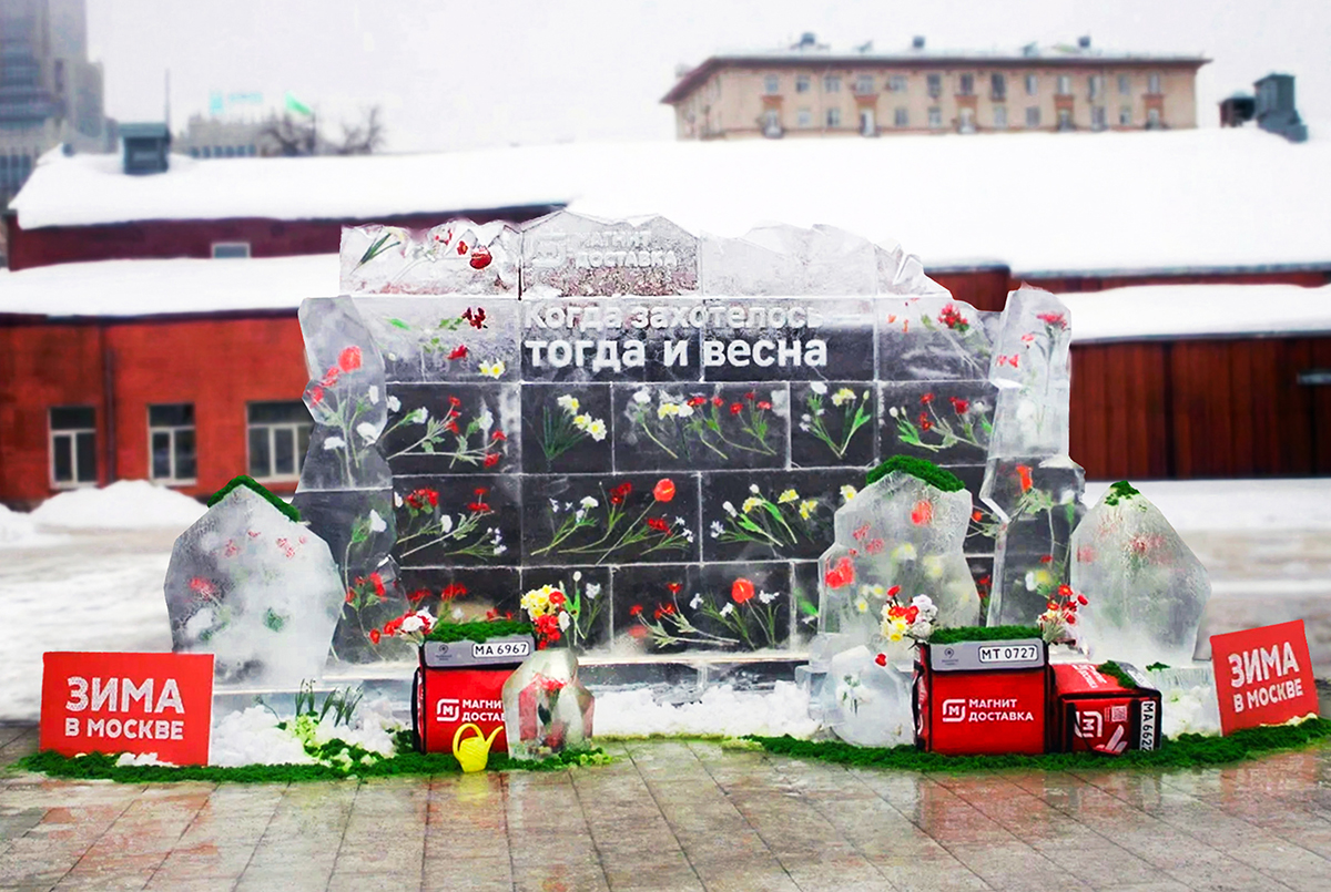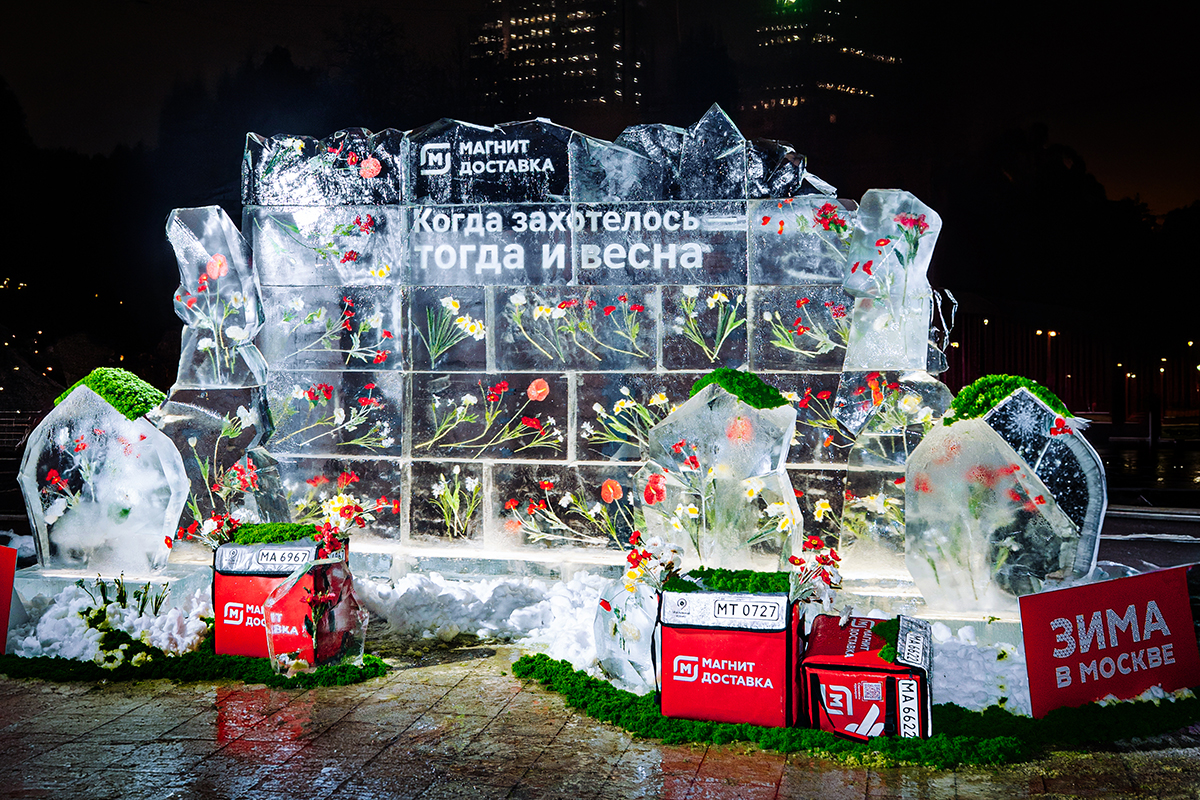 Сервис «Магнит Доставка» совместно с креативным агентством KITCHEN запустил необычную поп-ап зону в центре Москвы. В честь Дня всех влюбленных и в преддверии весны ритейлер установил в Саду «Эрмитаж» арт-объект изо льда с цветами внутри. Инсталляция работает 14 и 15 февраля, задавая новый тренд: «Когда захотелось – тогда и весна».