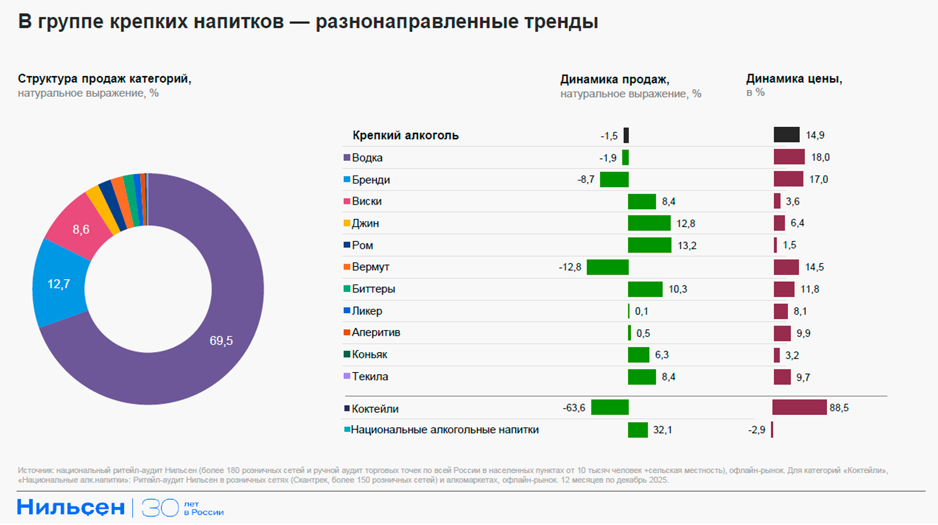 По данным нового исследования Нильсен, динамика развития «национальных» алкогольных напитков стала одной из самых заметных на алкогольном рынке — в натуральном выражении продажи группы данных напитков в 2025 году выросли на 32,1%. В то время как индустрия крепкого алкоголя, в которую входит водка, коньяк, виски и другие напитки, замедляется (-1,5% в натуральном выражении), «экзотический» алкоголь становится более привычной альтернативой традиционному. Так, группа «национальных» напитков по объемам продаж в 2025 году в полтора раза обогнала категорию коньяка и приближается к категории аперитивов.