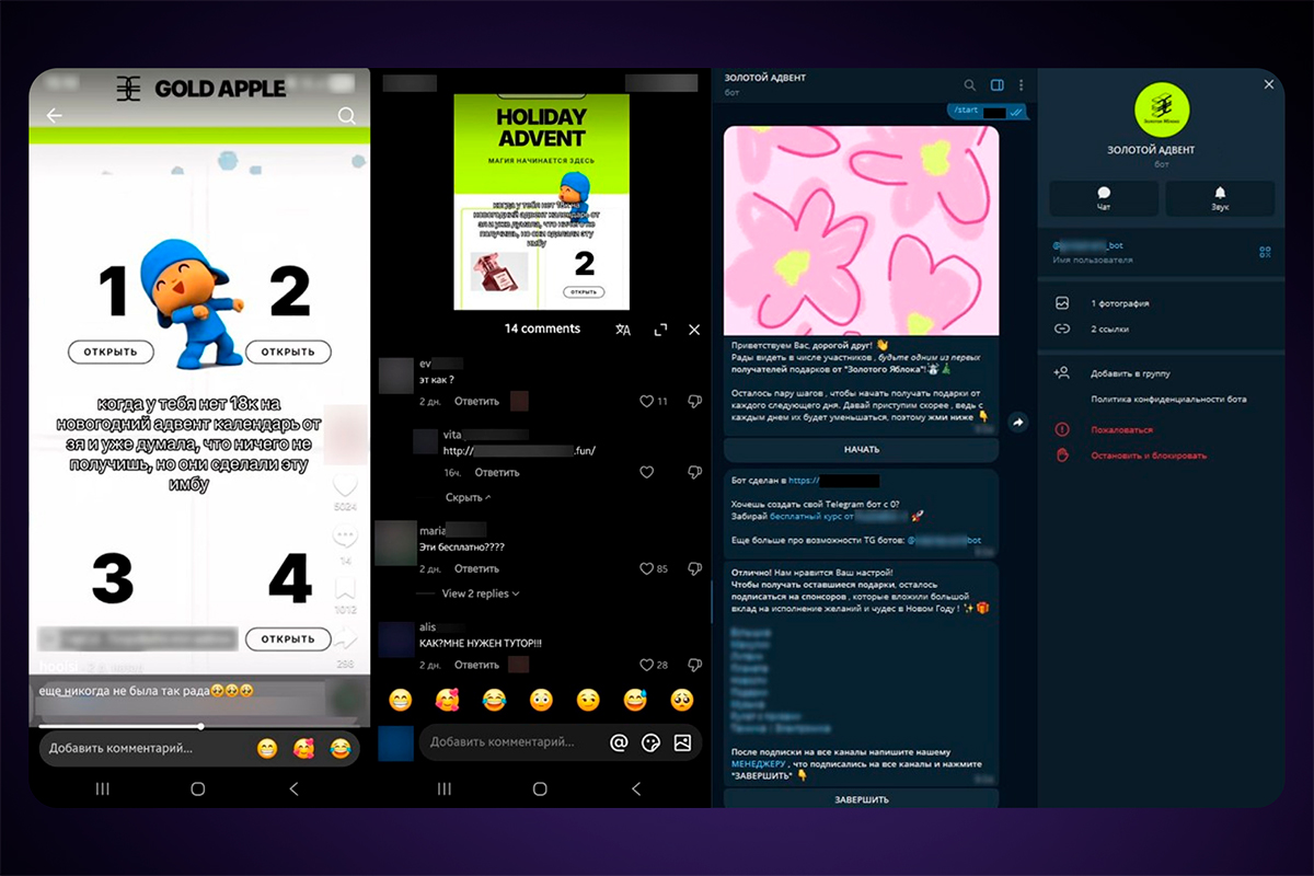 Вот как это работало. Через угнанные или новые аккаунты в TikTok распространялись видеоролики, анонсирующие «акцию» и предлагающие перейти по ссылке в комментариях или в профиле. Оттуда пользователей вели на сайт, визуально похожий на официальный ресурс ретейлера: там человеку предлагали открывать ячейки адвента и получать «гарантированный приз». Чтобы его получить, нужно было перейти в телеграм-бот, который был точкой управления: собирал аудиторию, навязывал подписки или переводил пользователя на дальнейшие действия вплоть до передачи своих персональных данных или платежей в пользу мошенников.