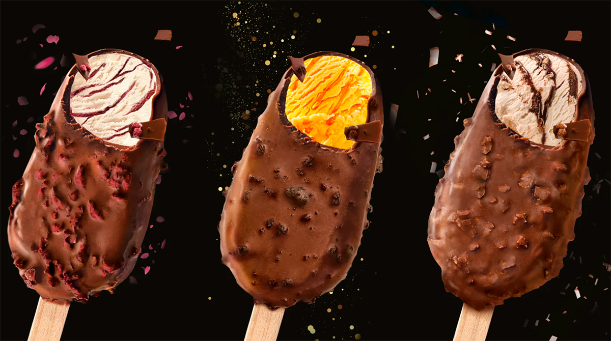 С развитием бренда и появлением в портфеле линейки эскимо, перед дизайнерами встала задача адаптировать успешную эстетику для нового формата, сохранив преемственность. Эскимо представлено в трех элегантных вариантах: