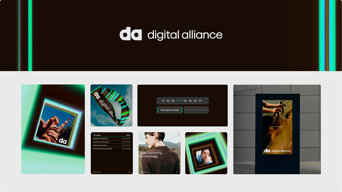 Центральным элементом айдентики стала работа с аббревиатурой «da» в названии Digital Alliance. Она используется как самостоятельный графический знак и формирует основу логотипа.
