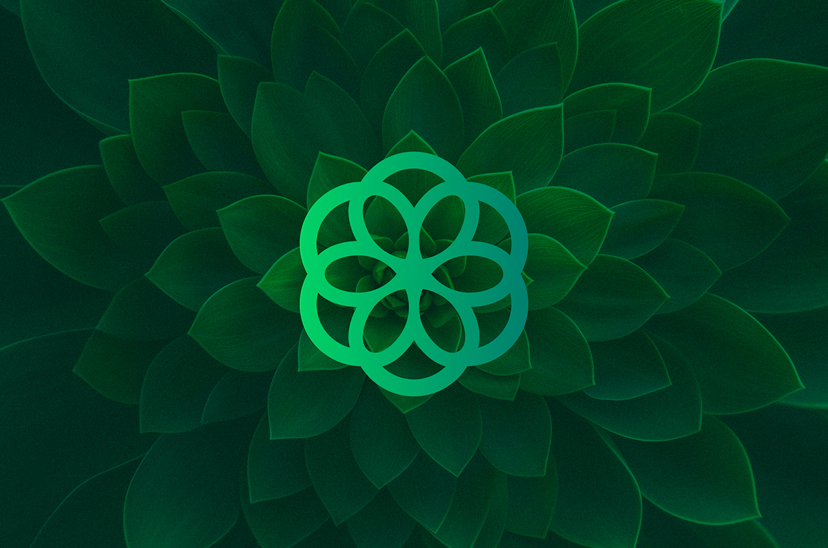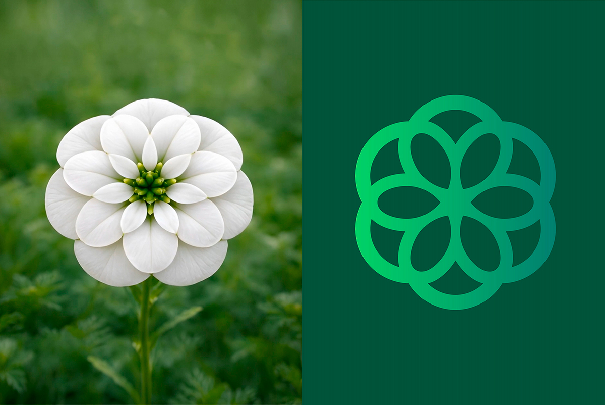 Мотив цветка также встроен в типографику: буквы «О» в логотипе получили мягкую трансформацию и визуально отсылают к форме цветка, создавая тонкую связь между графикой и текстом.