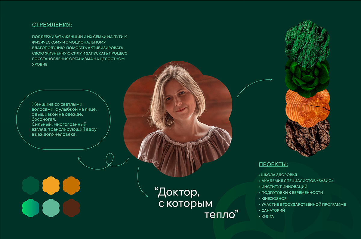 Это образ, который соединяет профессиональную медицинскую экспертизу с глубокой человеческой миссией — заботой о здоровье семьи и поддержанием гармонии между поколениями. Позиционирование отражает ключевые ценности бренда: научную основу работы, заботу, принятие, внимание к человеку, семье и роду как системе.