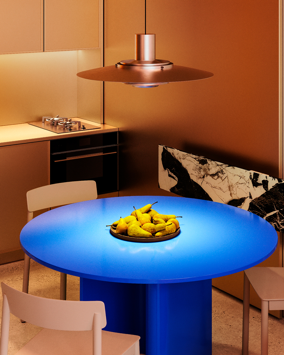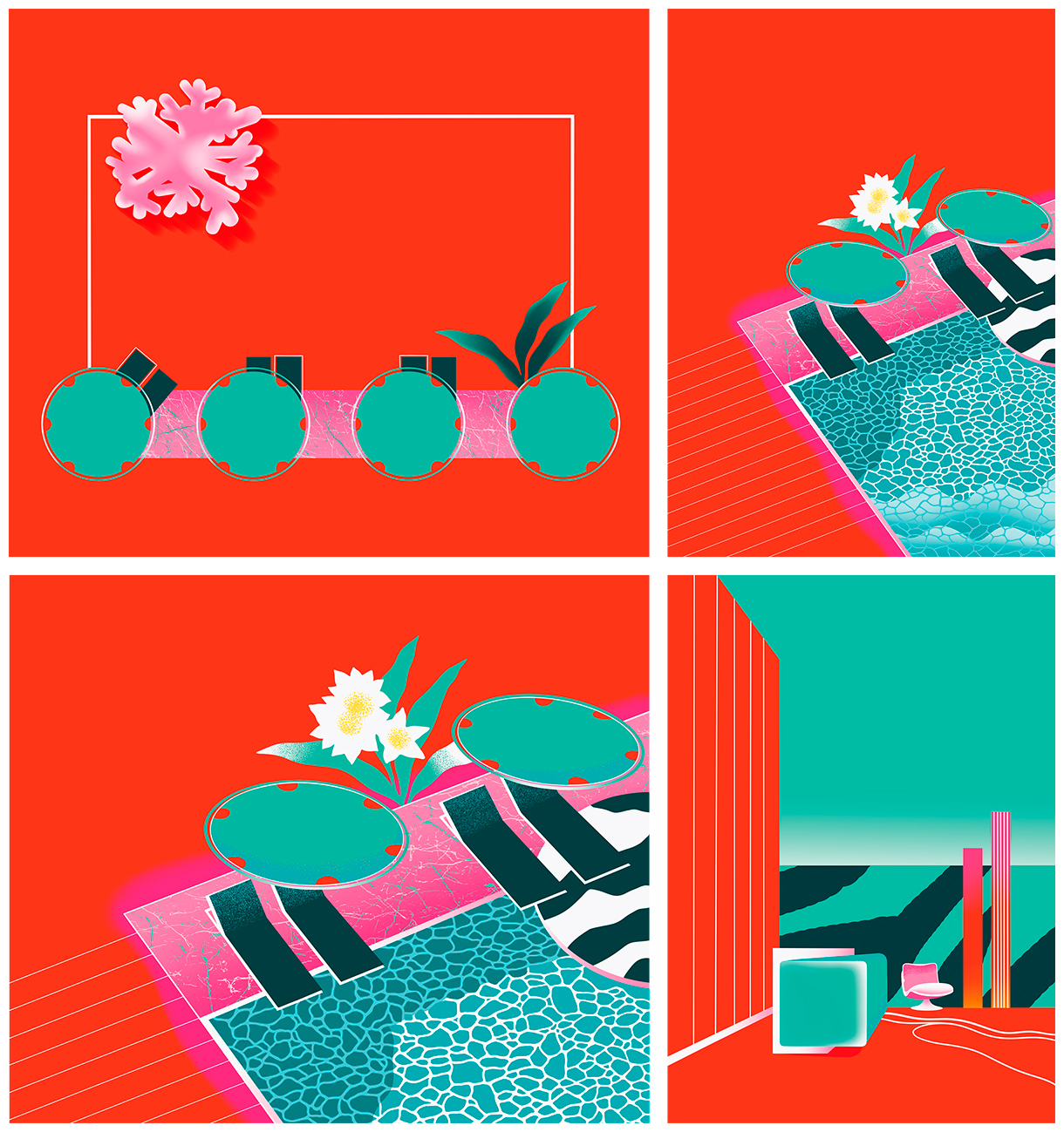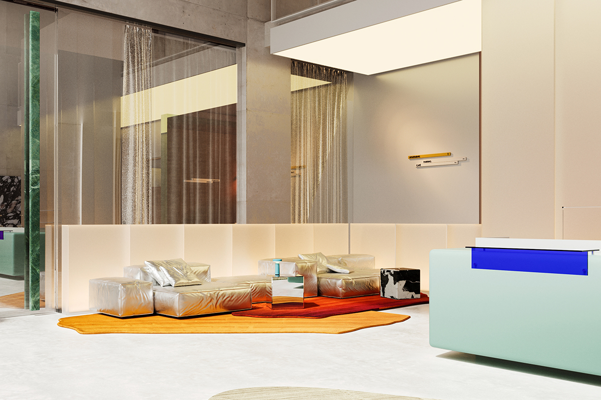 - Цветовая палитра. Вместо бежевых оттенков выбрали насыщенную палитру: ярко-красный, бирюзовый, розовый, рыжий и глубокий зеленый. Цвета взяты с ориентиром на интерьеры DA BUREAU — они создают ощущение энергии, но выглядят благородно.