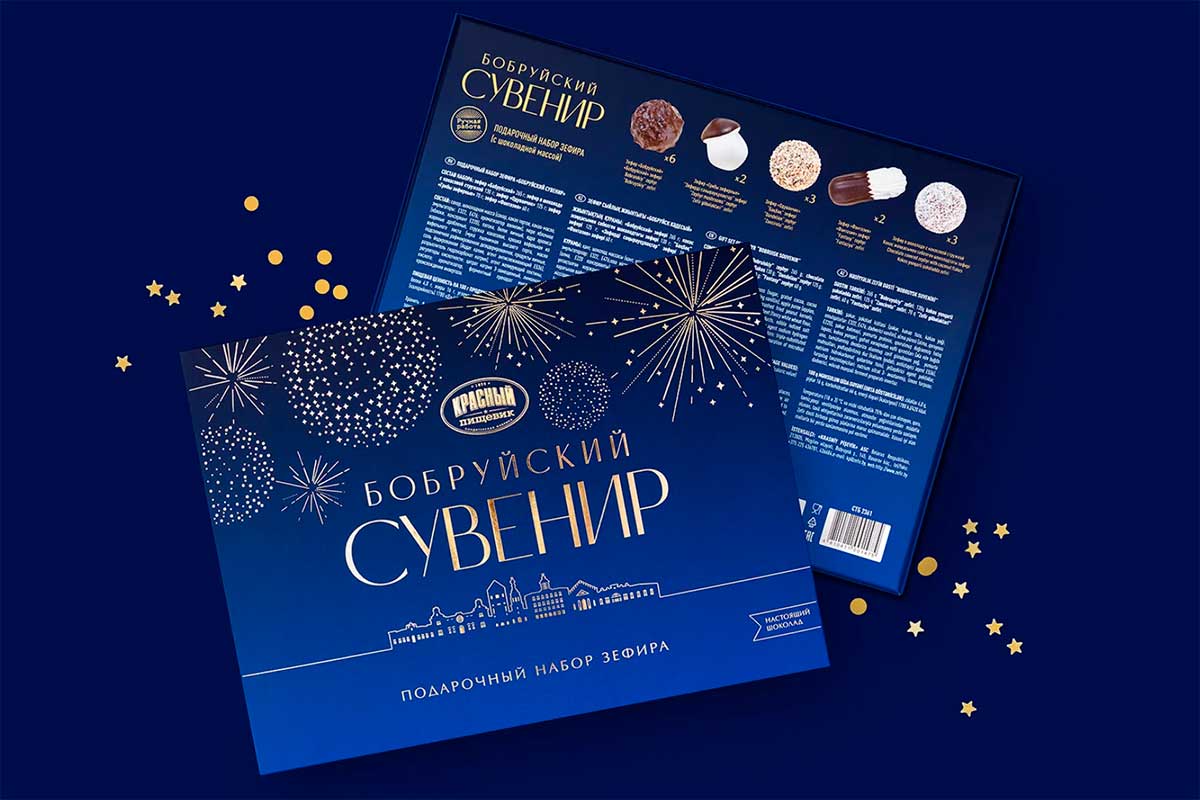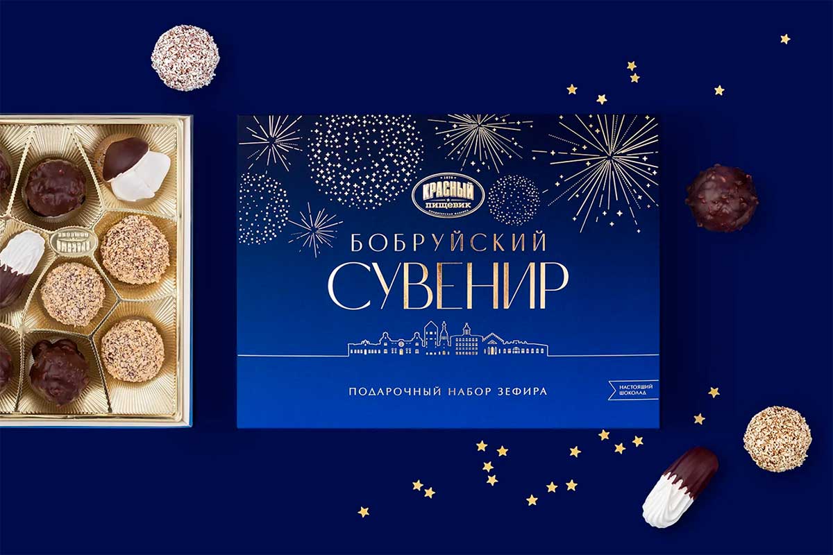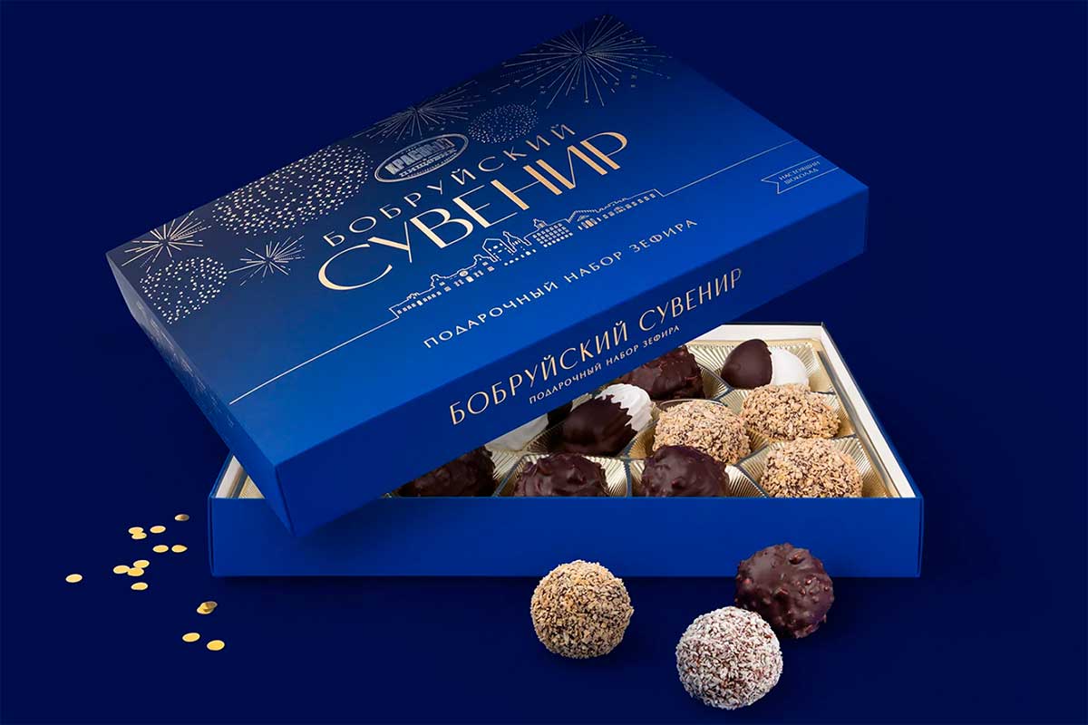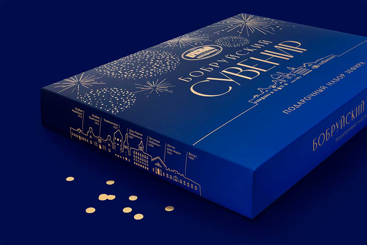 «Бобруйский сувенир» – это большой набор-ассорти весом 650 грамм, он включает 5 видов зефира ручной работы в натуральном шоколаде. Это визитная карточка города и один из любимых подарков, который увозят с собой на память гости. Разрабатывая новый дизайн упаковки, из культовых зданий с историей команда Brama Branding собрала узнаваемый силуэт: над вечерней панорамой Бобруйска, который встречает гостей ярко освещенными окнами, расцветают золотые фейерверки.