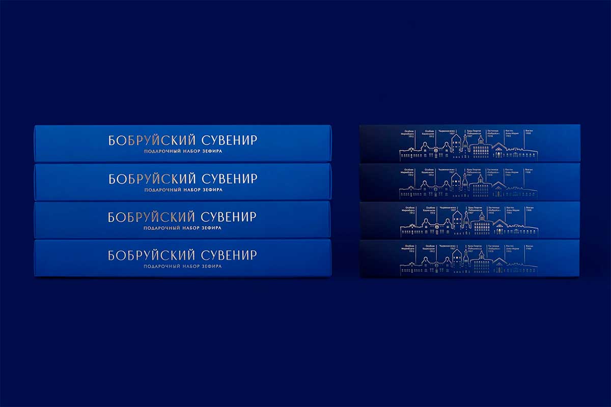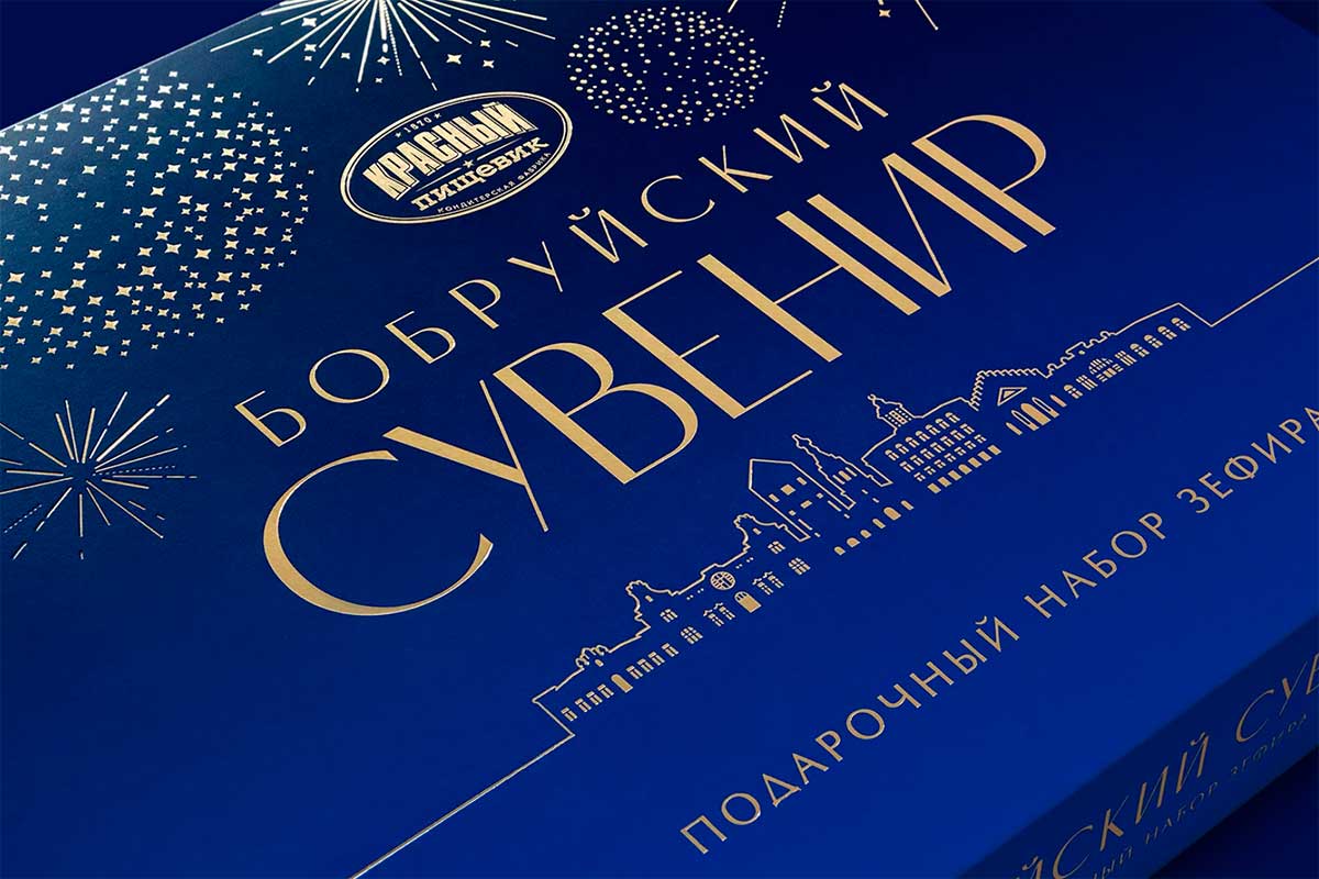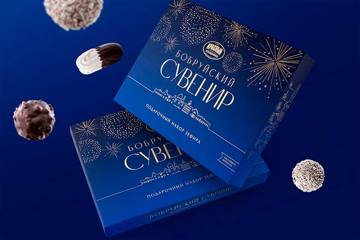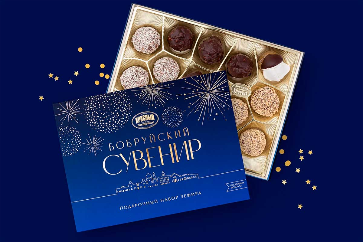 «Бобруйский сувенир» – это большой набор-ассорти весом 650 грамм, он включает 5 видов зефира ручной работы в натуральном шоколаде. Это визитная карточка города и один из любимых подарков, который увозят с собой на память гости. Разрабатывая новый дизайн упаковки, из культовых зданий с историей команда Brama Branding собрала узнаваемый силуэт: над вечерней панорамой Бобруйска, который встречает гостей ярко освещенными окнами, расцветают золотые фейерверки.
