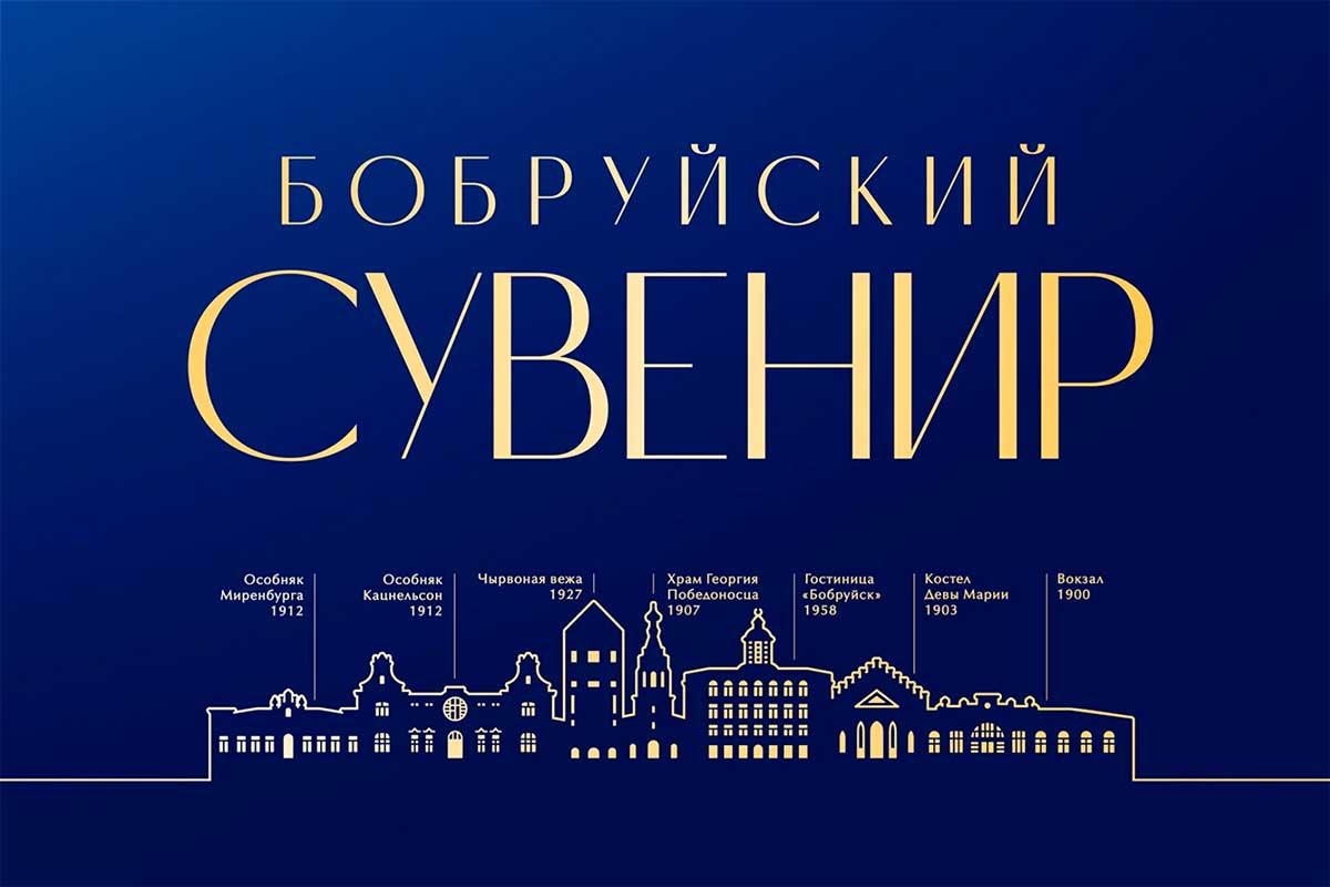 В названии «Бобруйский сувенир» ленточная антиква задает стиль и элегантность. Слово «сувенир» выделено по масштабу, чтобы поддержать позиционирование продукта.