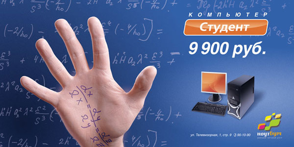 Рекламной группой «Мелехов и Филюрин» для салона компьютерной техники «Ноутбум» была разработана серия плакатов наружной рекламы. Для этого было выбрано три целевых аудитории и соответственно три ценовых категории компьютеров.Категории: для студентов и школьников (подешевле), для геймеров (подороже) и для женщин (покрасивее).