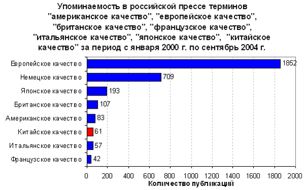 Как видно из диаграммы, наибольшее распространение получил термин "европейское качество". Это во многом обусловлено тем, что Европейский союз в свое время ввел общеевропейские стандарты на многие товары и услуги. Кроме того, в русском языке в последние 10 лет возникли и устойчиво закрепились такие термины, как "евроремонт", "евровагонка", "евростандарт", "евророзетка", "евроокна" и т.п., которые также символизируют "европейское качество" и дополнительно стимулируют употребление этого термина. Это широко используется в рекламе товаров, реализуемых на российском рынке (например, "европейское качество по российским ценам").