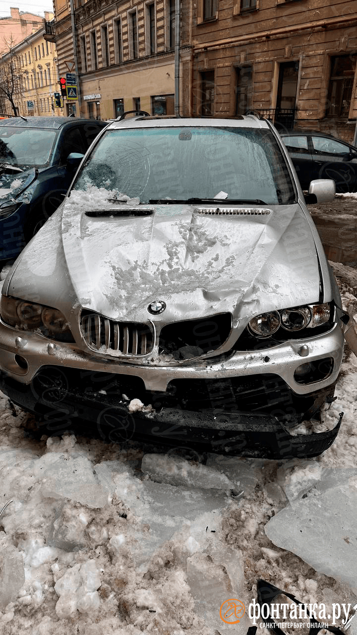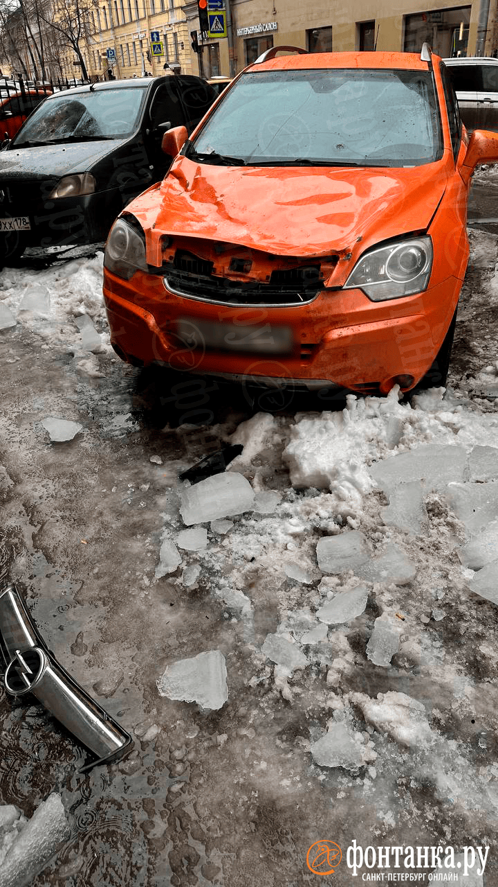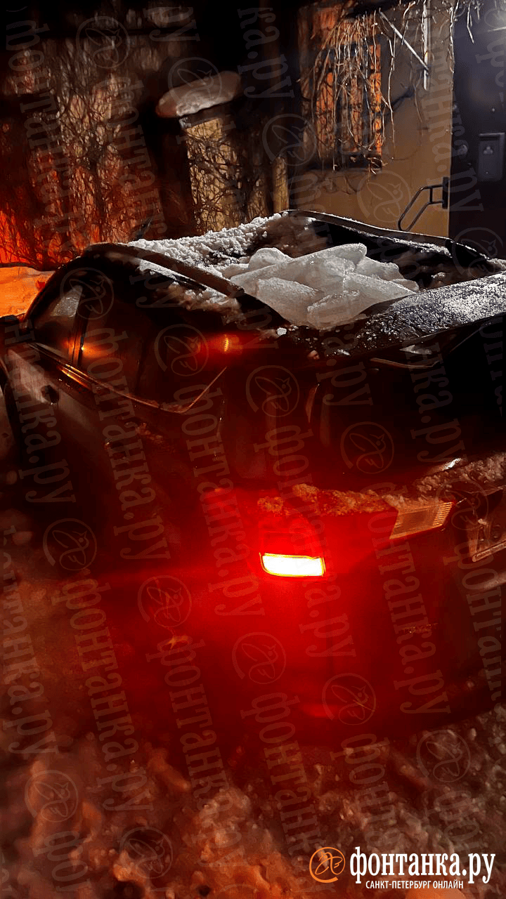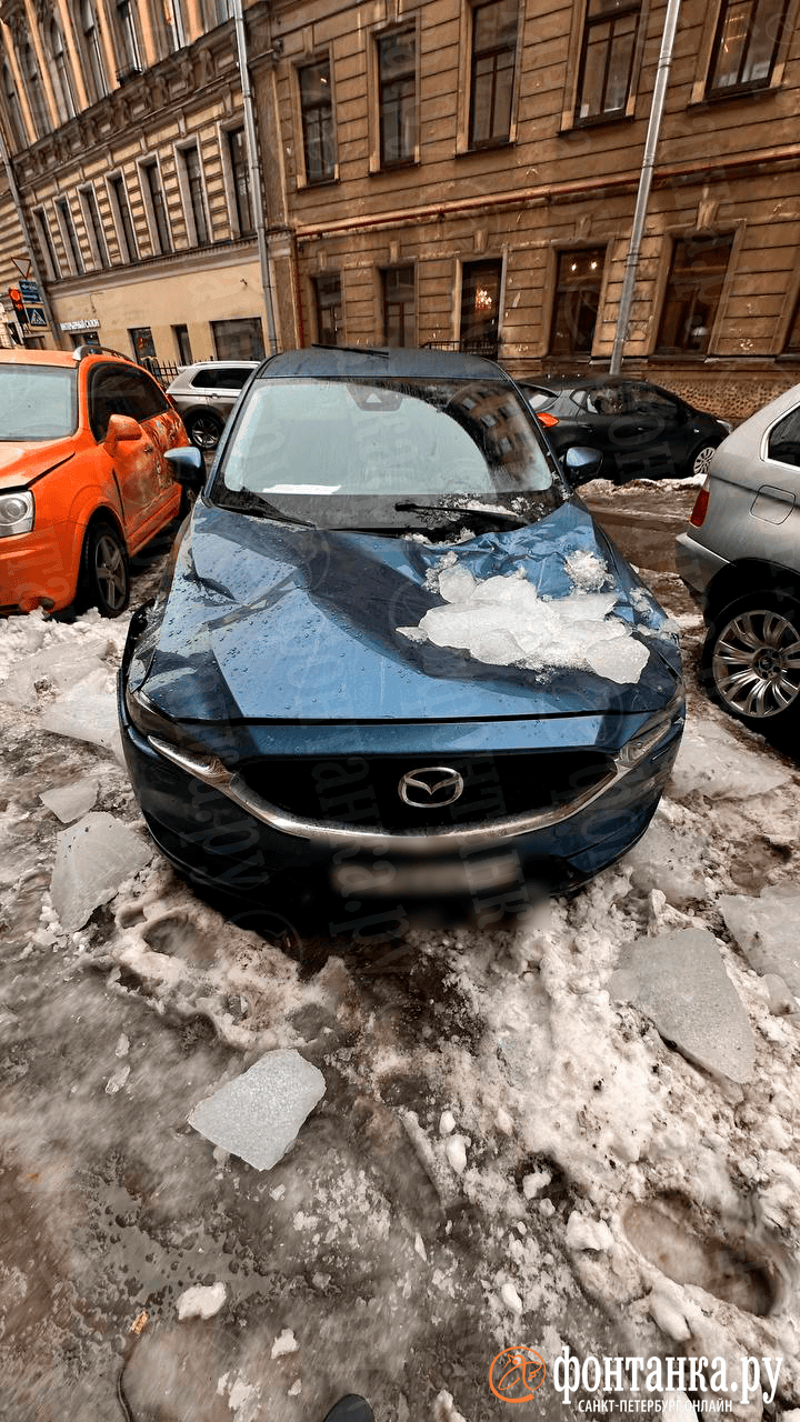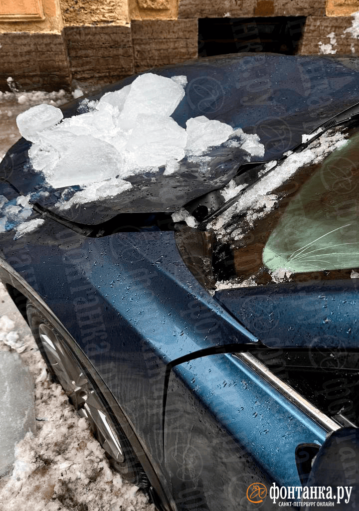 На 7-й линии Васильевского острова, у дома Пеля (16–18), ледяная глыба размером с футбольный мяч рухнула прямо на припаркованный автомобиль. Анна, чей автомобиль пострадал, рассказала, что заехала во двор разгружать вещи.