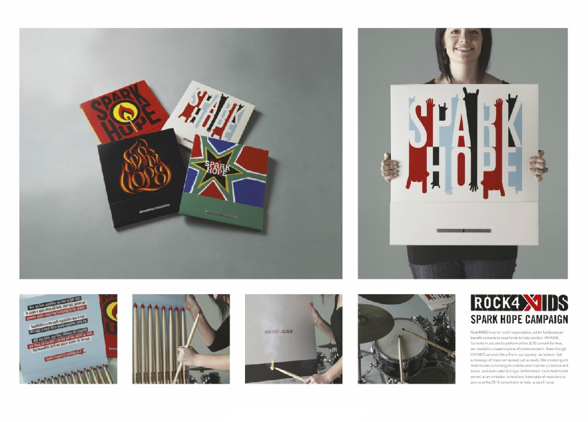 Describe the creative solution to the brief/objective. Even though HIV/AIDS spreads like a fire in our country, we believe that a message of hope can spread just as easily. We created giant matchbooks containing drumsticks which can be pulled out and struck, and which can be used during a performance. Each matchbook serves as an invitation to local and international artists to join us at this year`s concert and to help us spark hope.