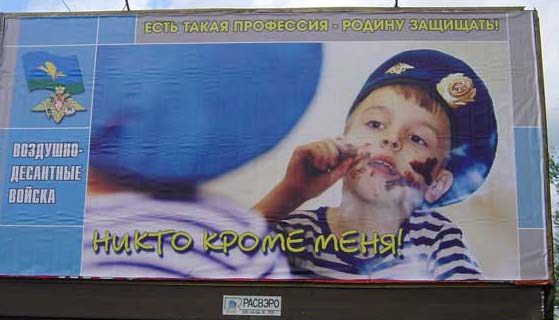 Описание: Прямо около метро "ВДНХ" висит огромный билборд, посвященный Дню десантника. Кто "скреативил", что ребенок, мажущий лицо дерьмом, это соответствует духу "праздника" - не знаю!...))) А вот сфотографировать и отослать Вам на конкурс - получилось!...)))
